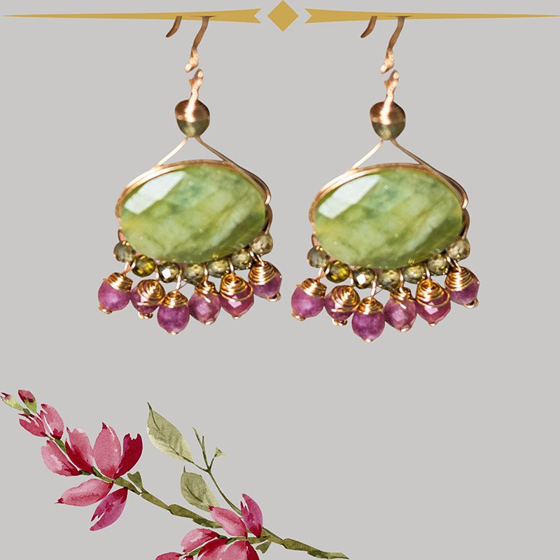 עם תליוני אבני חן טורמלין ורודות. קליל על האוזן.