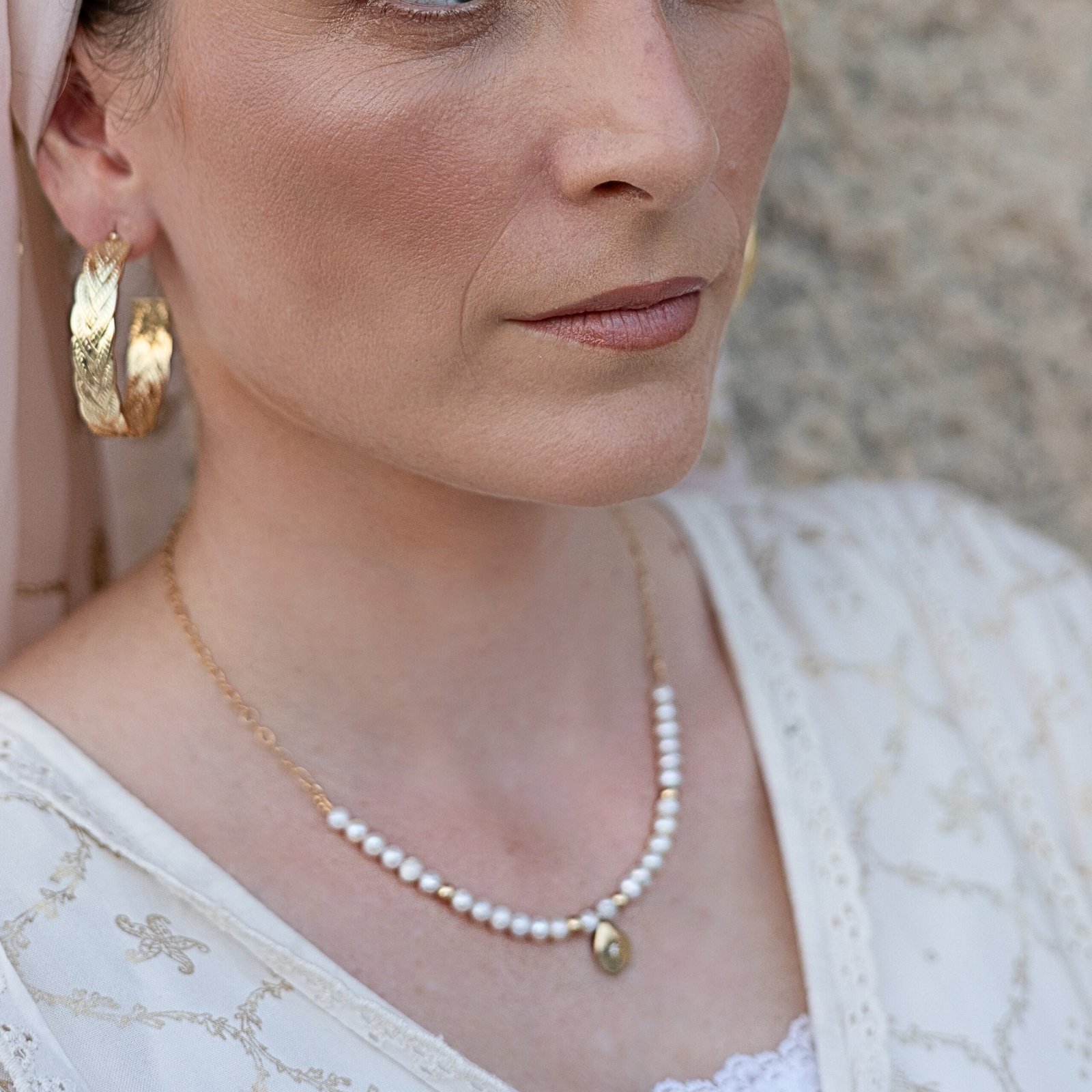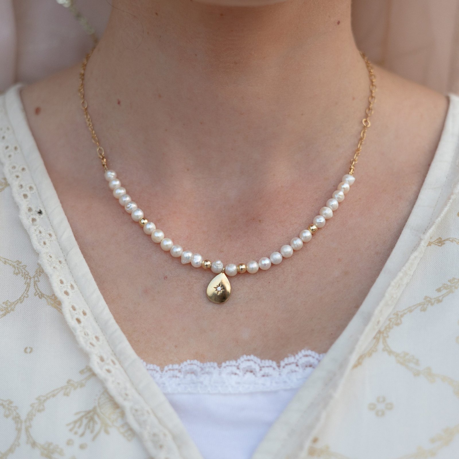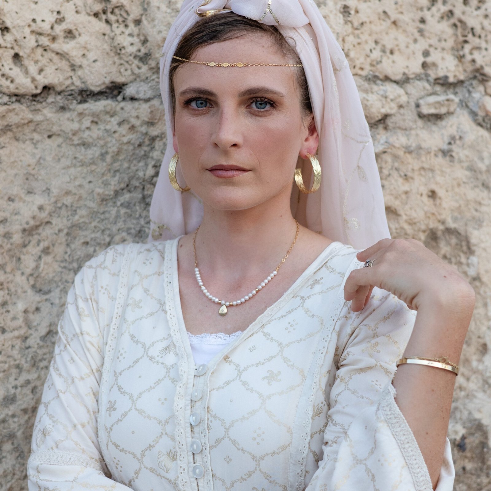 שרשרת זו, בשילוב פנינים לבנות המסמלות טוהר ונשיות, עם נגיעות זהב חמות, נושאת עמה תדר של חיבור בין שמיים לארץ, בין עדינות לעוצמה.